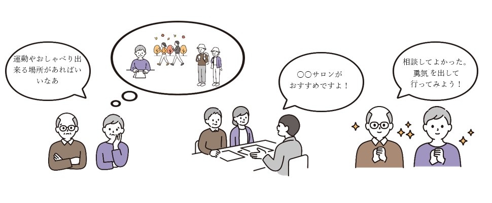 地域の様々な情報(地域での集まり、支え合い活動、高齢者の困りごとなど)を把握するために、積極的に地域へ出向いています。みなさまから頂いた声の中から必要とされる新しい取り組みを多様な主体(地域住民、地縁組織、介護保険事業所、民間企業、NPO法人、ボランティア団体など)と一緒に考えます。