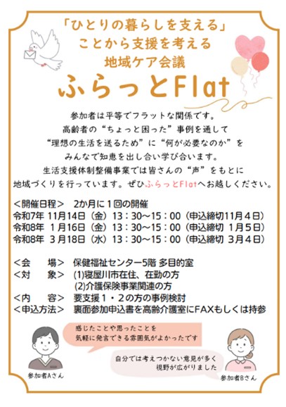 様々な団体(地域住民、地縁組織、介護保険事業所、民間企業、NPO法人、ボランティア団体など)個人と連携し、地域課題について意見交換を行い解決策の検討を行っています。高齢者のみなさまがいつまでも元気で暮らし続けることが出来るような「イイマチ、ネヤガワ」を作ってきたいという思いをお持ちの団体様・個人様を探しています。住みやすい街、寝屋川の実現のために私たちと繋がりませんか。